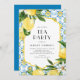 Invitación a una fiesta de té con tema de limón con ilustraciones acuarelas de limones, flores de limón y tejas mediterráneas. Personalice agregando nombres, fecha, hora y otros detalles. Este brunch de limón es perfecto para los fiestas de verano y de té temático mediterráneo.