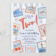 Pinch me.... Im Two! Coastal Stamp 2nd Birthday Invitation is perfect for your little one's nautical-themed celebration. Featuring a pale blue background decorated with whimsical stamps displaying lively red lobsters, light house, cherries, waves, fish, and other beach illustrations. This design brings festive charm in shades of red, white, and blue. Set the scene for a memorable second birthday with this fun, trendy template. Personalize your celebration by inviting friends and family with this themed invitation.