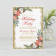 Elegante acuarela Poinsettia Floral Rojo y Gold Script Invitación fiesta incluye hermosas poinsettias acuáticas, vegetación botánica, follaje de invierno, bayas huecas, rosas blancas, conos de pino y bayas azules. Marco Purpurina dorado.