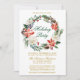 Elegante acuarela Poinsettia Floral Wreath Green y Gold Script Holiday Party Invitation incluye hermosas poinsettias rojas acuarelas, vegetación botánica, follaje de invierno, bayas huecas, rosas blancas, conos de pino y bayas azules.