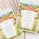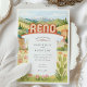 Celebre su gran día con esta vibrante invitación a una boda acuarela inspirada en el encanto pintoresco de Reno, Nevada. Las obras de arte muestran el emblemático cartel "Reno" de estilo retro con un telón de fondo de montañas boscosas, colinas onduladas y arquitectura occidental clásica. Flores del desierto, suculentos verdes y flores silvestres coloridas enmarcan la carta con un ambiente fresco y alegre. La paleta incluye corales cálidos, amarillos dorados y verdes polvorientos, perfectos para un boda al aire libre o de moda rústica. El lado inverso continúa con el tema floral mientras proporciona espacio para los detalles adicionales del evento. Ideal para nevadas o parejas que planean una boda de destino montañoso-desierto.