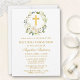 Elegant Watercolor White Floral Wreath First Holy Communion Invitation includes white roses, hydrangeas and greenery. Gold Cross.