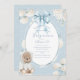 Sweet little bear in a white coat and blue satin bow flowing over the event details. White hydrangeas and a blue and white shabby chic polkadot background, We’ve used lovely fonts and scripts done in coordinating colors baby shower invite. Hydrangeas.