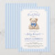 This sweet baby shower invitation features an adorable teddy bear accented with a soft blue bow, framed by elegant pastel blue stripes and graceful typography. The design has a gentle, classic feel that makes it perfect for welcoming a baby boy with warmth and style.