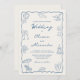 This whimsical coastal dusty blue and ivory wedding invitation is elegant with a relaxed seaside aesthetic, featuring a wavy scallop frame, hand drawn beach doodles, and casual handwriting script.