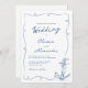 This whimsical hand drawn white and navy blue nautical wedding invitation features a squiggly frame with an anchor in the lower right corner.