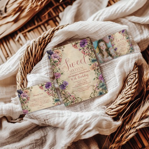 A soft, romantic Sweet Sixteen design wrapped in vintage wildflower illustrations and muted pastel tones. The hand-drawn blooms create an elegant botanical frame, while the warm parchment background adds a timeless, heirloom feel. Perfect for a dreamy celebration with a gentle, feminine aesthetic. Personalize with your details to make it truly unforgettable.