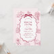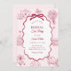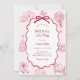 Set against a soft light pink backdrop, this invitation exudes whimsical elegance. Delicate hand-drawn doodles—teacup, teapot flower bouquet, fluttering butterfly, macaroons, cupcake, croissant, bird, and cute bumblebees—dance around the edges, framed by a graceful wavy border adorned with ribbon bow. The typography blends modern minimalism with elegant script, creating a sophisticated yet playful tone. Perfect for celebrating love, laughter, and the bride-to-be over tea and sweet treats.