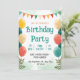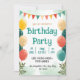 This is a charming and vibrant birthday invitation designed in a whimsical watercolor style perfect for festive celebrations. The card features a delightful composition with colorful character balloons (in yellow, cream, coral, and teal), decorative bunting flags in warm and cool tones, and elegant botanical accents with eucalyptus leaves. The soft watercolor background in pale greens and creams creates an inviting, cheerful atmosphere. The design combines playful elements with sophisticated artistic touches, making it suitable for both casual and semi-formal birthday gatherings.