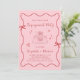 Invite friends and family to celebrate your engagement with this charming party invitation featuring a whimsical red wavy frame, sweet hand-drawn bows, and a romantic table illustration accented with hearts and sparkles. The pink background and modern script lettering create a playful yet elegant look that perfectly suits a joyful engagement gathering. The back of the card includes space for a full photo—ideal for showcasing a favorite engagement picture or a special moment together. Easily personalize your names, event details, and photo in Zazzle’s design tool to create a custom invitation that feels uniquely yours.