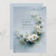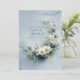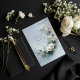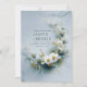 Invite your guests to a celebration of pristine elegance and ethereal beauty with this exquisite wedding invitation. The design is dominated by a dramatic, crescent-shaped floral arrangement set against a serene cool dusty blue backdrop with subtle watercolor shading. The focal point is a unique cluster of pristine white daisy-like flowers framed by striking dark blue/teal pine-like needles and shimmering metallic gold sprigs, which create a beautiful, spiky texture. The composition is accented by a flowing, thin gold line that traces the arc of the crescent, enhancing the opulent, cool-weather aesthetic. This sophisticated, artistic blend perfectly sets the stage for a classic, luxurious, or winter-themed celebration. This invitation card is ideally suited for a winter wedding ceremony, a high-end formal engagement announcement, or a serene vow renewal ceremony. It would also perfectly suit a chic bridal shower or a sophisticated seasonal holiday party. The card's captivating blend of pristine florals and a moody, monochromatic backdrop ensures it is versatile for any solemn ceremony, corporate gala, or refined birthday announcement.
