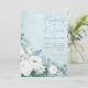 White Roses Hellebores Silver Eucalyptus floral wedding invitation featuring elegant calligraphy script modern watercolor flowers frosty pale blue background and snowflake details