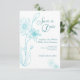Moderno cuadrado contemporáneo caprichoso floral en azul aqua sobre blanco con letras en verde teal de Budget Bridal. Flor de tallo único dibujada a mano con lirio de agua y hojas, con flores adicionales dibujadas a mano en la parte posterior. Invitaciones personalizadas personalizadas económicas y asequibles para su día especial de boda sin sacrificar la calidad ni parecer baratas. ¡Sé atrevido! ¡Diviértete! ¡Sé feliz! ¡Ahorra dinero!
