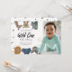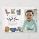 Cute and fun kid's first birthday party invitation featuring illustration of safari animals of giraffe, snow leopard, rhino, lion, elephant, and zeebra. The text says "Wild One." Perfect for a boy's 1st birthday party. Add your child's photo as well on the front of the card.
