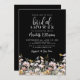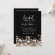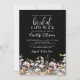 Muted Pastel Boho Botanical Garden Bridal Shower Invitation. Celebrate the bride-to-be with this elegant boho design featuring a black background on both sides paired with crisp white fonts for a striking yet delicate look, perfect for gatherings from spring through autumn. The top of the invitation features the phrase “Love is in Bloom,” which can be customized to suit your theme or removed for a cleaner, more minimal style.