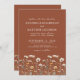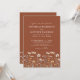 The background is a warm burnt orange or terracotta on both sides, with the text in elegant dark gray fonts. Handwritten script blends with modern serif typography for a clean, contemporary feel. The muted floral palette complements a variety of wedding styles, from rustic outdoor gatherings to chic metropolitan events.