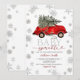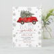 Celebrate your little one’s upcoming arrival with this charming Winter Baby Sprinkle Invitation, featuring a vintage red car carrying a Christmas tree among soft gray snowflakes.