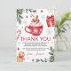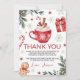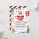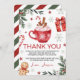 A festive winter birthday thank you card featuring a red cocoa mug with whipped cream and cinnamon, candy canes, snowflakes, pine greenery, and a holiday gift illustration. Designed in a warm Christmas-inspired palette, this card is perfect for winter or holiday birthday celebrations. Includes space for a personalized message of gratitude and works well for children’s seasonal parties and first birthdays.