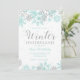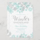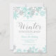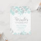 Invitación de invierno a la región de Onederland por primera cumpleaños con copos de nieve verde azulados y purpurinas de plata.