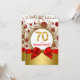 Invitación de la mujer a la fiesta de cumpleaños número 70, roja y dorada, con puntos purpurinas rojos y dorados y ráfagas de estrellas. Esta hermosa invitación de cumpleaños roja y dorada se personaliza fácilmente para tu evento simplemente agregando tus detalles en el estilo de letra, color y texto de tu elección. Este es un diseño impreso sin joyas reales, purpurinas, arcos, etc. Puede quitar la capa dorada de la parte delantera y trasera y añadir un color de fondo de su elección.