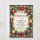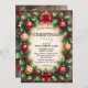 Una impresionante y rústica invitación a una fiesta de Navidades con un fondo de madera oscura. Cuenta con una florida corona verde, adornada con bayas clásicas rojas y pinares rústicos. Crimson brillantes y adornos dorados cuelgan dentro de la corona, acentuados por un dramático arco de terciopelo rojo. El texto editable, ideal para una fiesta de vacaciones corporativas, se representa en una mezcla festiva de fuentes rojas y verdes de menta. Este diseño promete elegancia tradicional para tu evento.