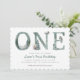 Elegantes, extravagantes y únicas invitaciones de primer cumpleaños con letras acuarelas con acuarelas y animales de bosque. Personalice agregando los detalles del fiesta en los campos de plantilla de texto proporcionados. El reverso de las invitaciones presenta un fondo de color gris claro.