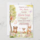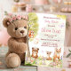 Woodland animals baby girl shower invitation featuring a watercolor bear, deer, and fox. This whimsical forest design includes soft pink florals and a sweet storybook feel, perfect for an enchanted nature-themed celebration.