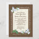 Flores silvestres de bosques de trillium blanco bonito sobre un aspecto de madera encuadran la invitación a la boda. Estilo de texto personalizar y tipos de letra como prefiera.