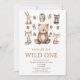 Invitación de primer cumpleaños de Woodland Woodland Wild One Cute invitación de cumpleaños a los niños con temas de bosque, con un patrón de oso, lobo, zorro, mapache, conejo y puercoespín en la parte superior de la invitación. Esta invitación de 1er cumpleaños silvestre de bosque también incluye algunas hojas de otoño.