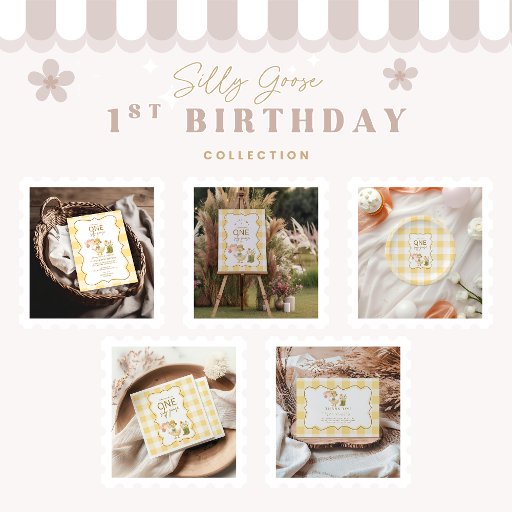 Celebrate your little one’s big milestone with this sweet and whimsical "One Silly Goose" birthday design. Featuring a charming goose in a dress, soft earthy florals, and a big golden bow, this design blends vintage cottagecore with playful storytelling. Perfect for a cozy garden party, spring gathering, or rustic milestone event.