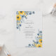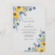 Vibrant yellow blooms contrast beautifully with muted slate blue foliage and delicate accent petals. This watercolor design features bright sunflowers and clusters of wild blue cosmos against a clean, crisp backdrop. Ideal for an outdoor summer ceremony or a rustic countryside event, the palette evokes a warm, cheerful atmosphere. The artistic brushstrokes and soft color transitions create a sophisticated yet relaxed aesthetic.