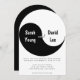 A simple black and white wedding design with the Yin and Yang symbol in the upper part, with the bride name written in white on black (yang, the feminine principle) and the groom name written in black on white (yin, the masculine principle) and the "and" between them written in script, both on black and white.