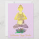 Una nueva invitación a los negocios de yoga decorada con una mujer en una posición de loto de yoga con una flor de loto y lirio de agua abajo ilustrada en cálidos tonos de color amarillo y púrpura con verde esmeralda.