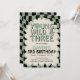 Celebrate turning three in the cutest trendy way! This Young Wild and Three birthday invitation features a modern sage green and black checkerboard background with playful retro typography and a soft scalloped frame.
