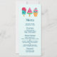 Menú de eventos con un ilustracion de 3 helados diferentes. Popsicle azul-verde con goteo de fresas y rociadores coloridos. Una pala de sandía. Un cono con capas de deliciosos helados en rosa y menta. Todo con sonrisas kawaii lindas.