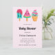 Una invitación a la ducha para bebés con un ilustracion de 3 helados diferentes. Popsicle azul-verde con goteo de fresas y rociadores coloridos. Una pala de sandía. Un cono con capas de deliciosos helados en rosa y menta. Todo con sonrisas kawaii lindas.