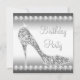Zapatos elegantes de tacón alto con diamantes negro y blanco invitaciones para fiesta de cumpleaños. Esta hermosa invitación para fiesta de cumpleaños con zapato de tacón alto con diamantes negro y blanco es perfecta para una dulce fiesta de cumpleaños de dieciséis años, Quinceanera, chica y mujer invitaciones para cualquier cumpleaños. Agregue sus detalles en la parte delantera y trasera simplemente añadiendo los detalles del evento, estilo de fuente, tamaño y color de fuente, y redacción.