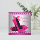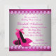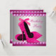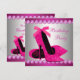 Tarjetas de invitación para la fiesta de cumpleaños de niñas o mujeres con zapatos de tacón alto y perlas rosa fucsia y rosa caliente. Agregue los detalles de su fiesta en la parte delantera y trasera, y puede elegir el estilo de letra y el color de la fuente.