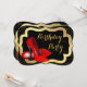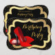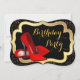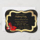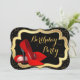 Zapatos rojos de tacón alto hermosos y brillantes, invitación a fiesta de cumpleaños con brillo negro y dorado. Esta elegante invitación de cumpleaños roja, negra y dorada se personaliza fácilmente para su evento.