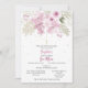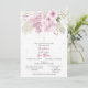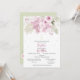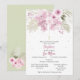 Las flores de acuarela rosadas y salvia adornan el frente de esta invitación. Acentuado con una simple cruz colgante. La parte posterior de la tarjeta es salvia con puntos blancos y un racimo adicional de flores. Parte de la "Colección Zoe".