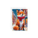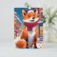 Ilustracion del alegre zorro antropomórfico sentado en la vibrante calle de la ciudad, ahora transformado para las vacaciones. El zorro, adornado con una bufanda roja juguetona y un pequeño sombrero de Santa, luce de alegría. El fondo urbano está empolvado de nieve suave y blanca, creando un ambiente acogedor y festivo. Los copos de nieve caen suavemente alrededor de la escena y los árboles que bordean la acera están decorados con luces brillantes y adornos coloridos. El coche vintage de color azul claro está ahora adornado con una corona en la parte delantera, lo que realza el encanto caprichoso.
