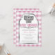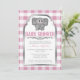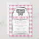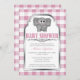 Las invitaciones a la ducha de bebé rosa y gris, con un adorable y afectuoso ilustracion de elefante de bebé sobre un patrón de gingham rosa y blanco. Estas son las invitaciones perfectas para cuando el bebé es un chica, o cuando el color favorito de la mami-a-ser es rosa.