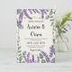 Celebra tu historia de amor con nuestras exquisitas invitaciones de bodas Violet Lavender y Eucalyptus. Estas invitaciones han sido diseñadas con el mejor gusto y combinan armoniosamente elegantes tonos violeta y lavanda suave, acentuados por la exuberante vegetación de las hojas de eucalipto. La combinación crea una estética serena y sofisticada, ideal para las parejas que buscan un tema romántico e inspirado en la naturaleza. Cada invitación, elaborada en papel de primera calidad, se detalla meticulosamente para garantizar una presentación elegante que cautivará a sus huéspedes. Ya sea que esté planeando una reunión íntima o una gran celebración, estas invitaciones marcan el tono para un memorable y encantador día de bodas. Personalice su invitación con sus detalles únicos para añadir un toque personal a este impresionante diseño.