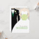 Elegante novia gráfica con velo y sosteniendo un pozo de rosas elegantes y verdes junto a su novio en un abrigo verde invitaciones informales a la boda. Edite estas invitaciones con sus propias palabras de invitación, lugar y nombres. Diseño único y arte gráfico por Sarah Trett para www.mylittleedenweddings.com