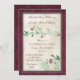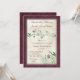 Elegantes invitaciones florales de bodas con un esquema de color burdeos y verde que hacen que estas invitaciones sean apropiadas para cualquier época del año, cualquier temporada. El cuerpo del frente es una textura de papel beige pálido, mientras que el borde delantero y el trasero son un ilustracion texturado de hormigón de color burdeos.