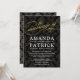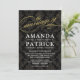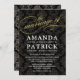 Invitaciones a la boda Art Déco Black and Gold Damask - presenta un fondo negro con un patrón vintage de damasco vintage de marfil oscuro o taupe en el frente y en la parte posterior con un guión elegante en oro impreso. Consulte la colección coincidente completa que se encuentra en esta página.