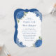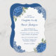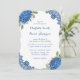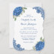 Ruidosas invitaciones a bodas azules con flores de hortensias azules, aliento de bebé y vegetación en un fondo blanco claro decorado con encaje floral azul.