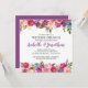 Magnífica exhibición de flores de verano en los bordes florales superior e inferior. Flores acuáticas de color rosa claro acentuadas con violeta profunda, rojo y azul. Mucha vegetación y hojas para mantener el diseño claro y aireado. Los nombres de las parejas bodas son púrpura profundo y también lo es el fondo. Una forma muy bonito de incorporar el púrpura, que es un color muy popular este año.