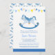 Caballo balancín azul pintado con estrellas y afiches gráficos, invitaciones para la ducha de niños. Original y caprichoso bebé hobby azul / balancín de caballos acuarela pintura y diseño gráfico de Sarah Trett para www.mylittleeden.com en zazzle.