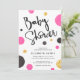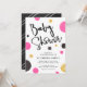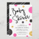 Invitaciones a la ducha Polka Dot Pink & Gold Baby con "Baby Shower" en escritura amistosa a mano y puntos de polka negros y dorados de gran color rosa flotando en una moda y diseño de moda. Invitaciones perfectas para las modernas y divertidas duchas para bebés chicas.